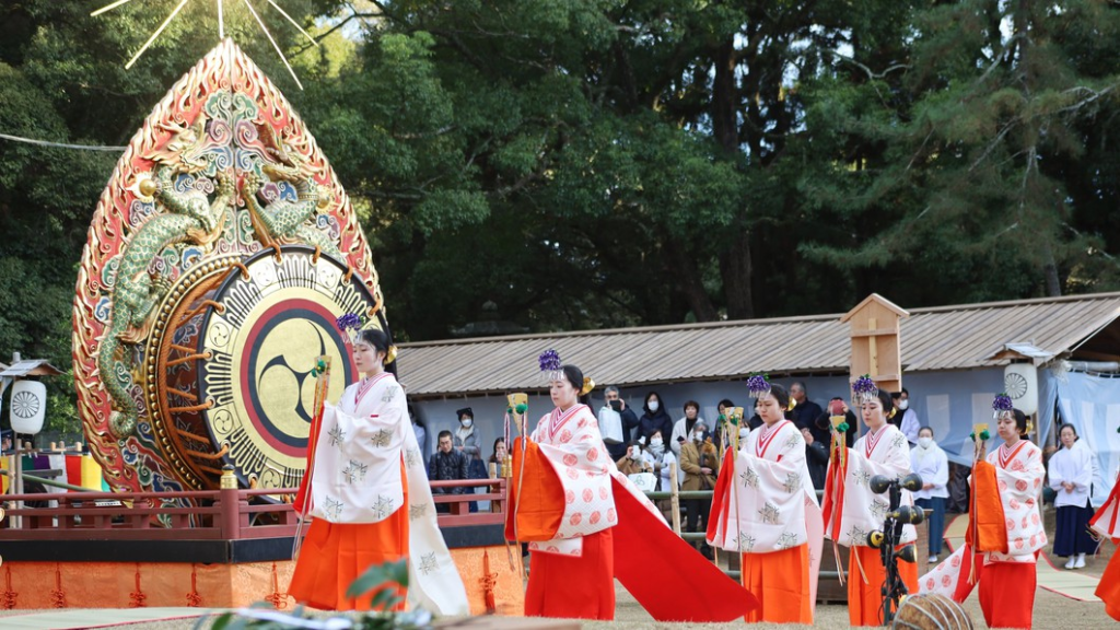 ここでは、神楽(かぐら)や舞楽(ぶがく)など、日本古来の音楽やダンスが夜遅くまで行われます。特に、龍の面をつけた「蘭陵王(らんりょうおう)」という舞は迫力満点。森の中で行われる野外フェスのような、幻想的な雰囲気を楽しめます。
